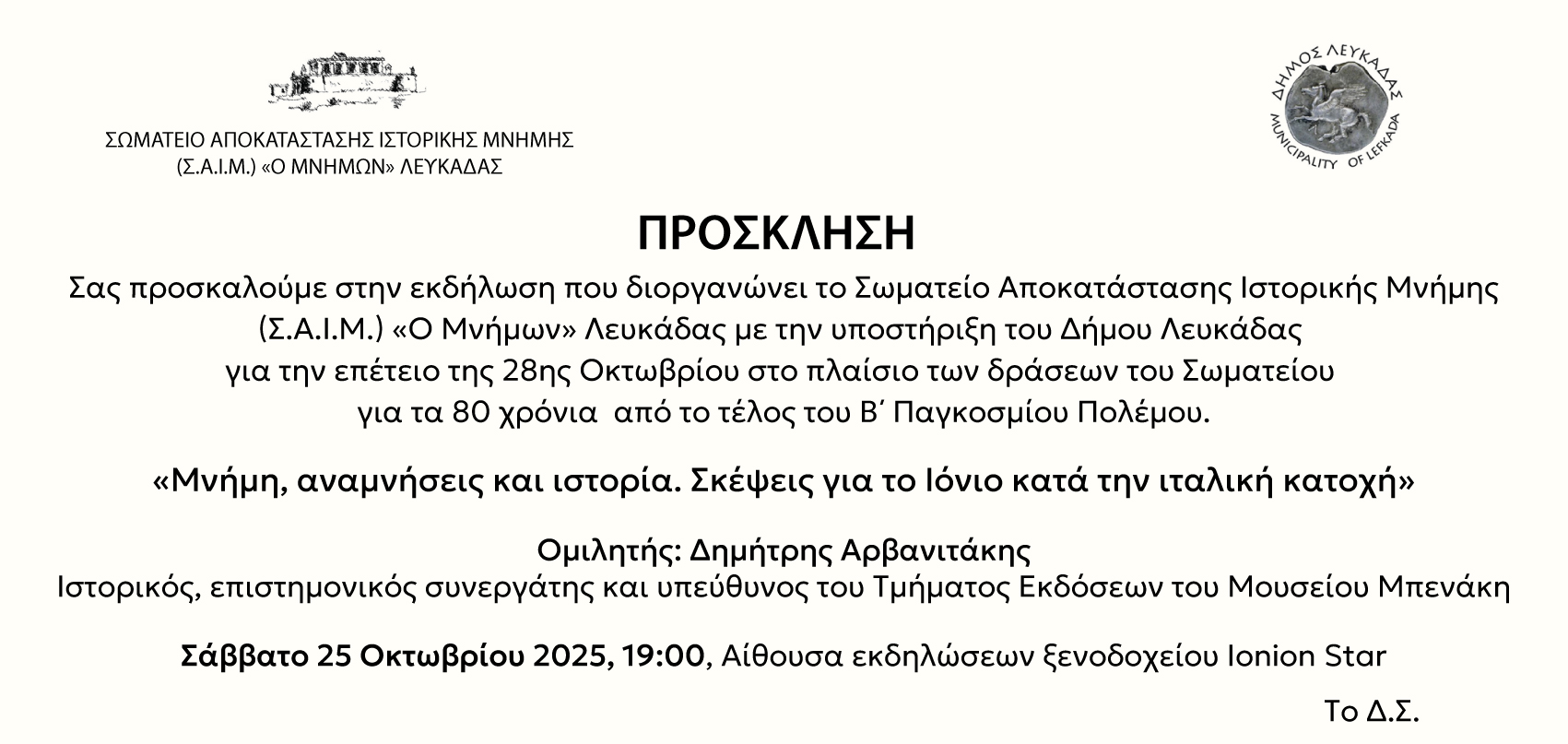 Tο Σωματείο Αποκατάστασης Ιστορικής Μνήμης (Σ.Α.Ι.Μ.) «Ο Μνήμων» Λευκάδας με την υποστήριξη του Δήμου Λευκάδας διοργανώνει εκδήλωση για την επέτειο της 28ης Οκτωβρίου στο πλαίσιο των δράσεων του Σωματείου για τα 80 χρόνια από το τέλος του Β΄ Παγκοσμίου Πολέμου.