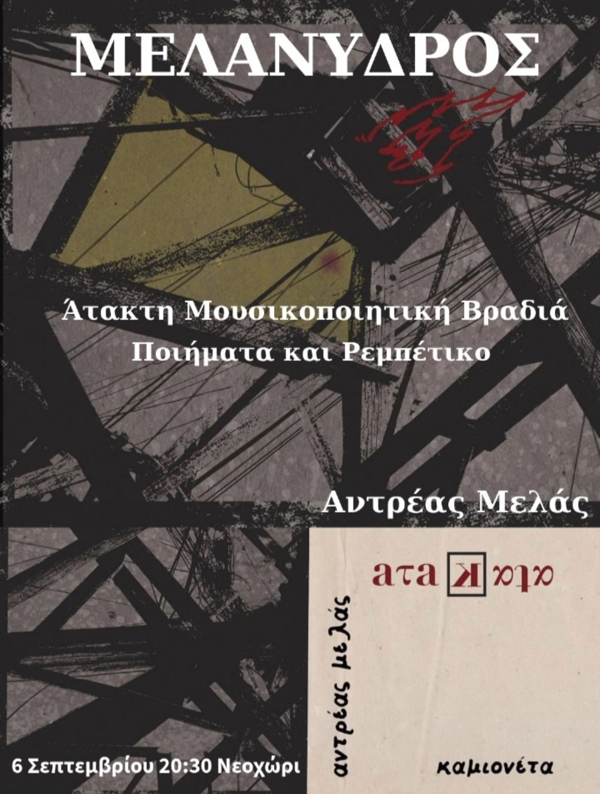 Ο ΜΕΛΑΝΥΔΡΟΣ σας προσκαλεί το Σάββατο, 6 Σεπτεμβρίου και ώρα 20:30 στο Νιοχώρι σε μια βραδιά ποίησης και μουσικής με αφορμή την παρουσίαση της νέας ποιητικής συλλογής του Αντρέα Μελά.