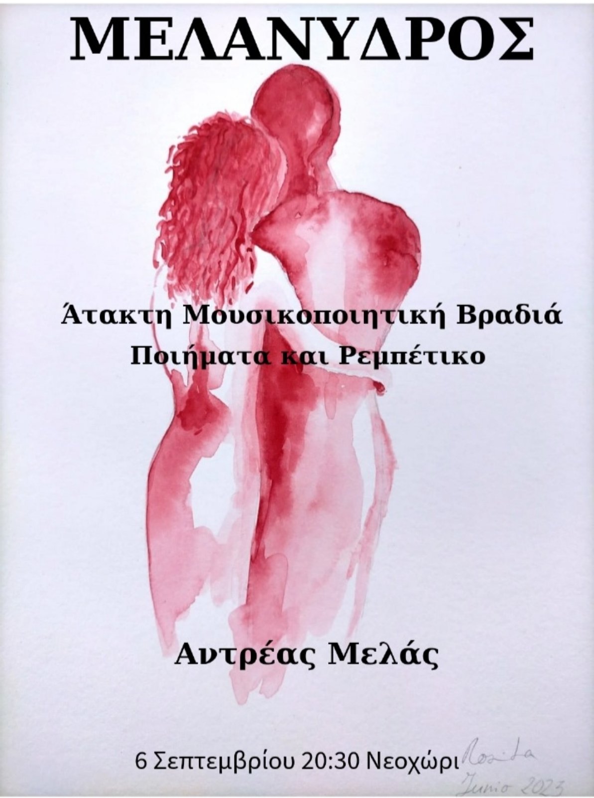Ο ΜΕΛΑΝΥΔΡΟΣ σας προσκαλεί το Σάββατο, 6 Σεπτεμβρίου και ώρα 20:30 στο Νιοχώρι σε μια βραδιά ποίησης και μουσικής με αφορμή την παρουσίαση της νέας ποιητικής συλλογής του Αντρέα Μελά.